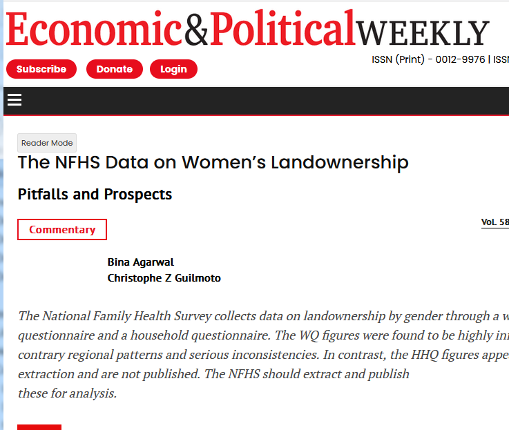 Agarwal, Bina and Christophe Z. Guilmoto. 2023. “The NFHS Data on Women’s Landownership: Pitfalls and Prospects.” Commentary, Economic and Political Weekly, 58(33)
