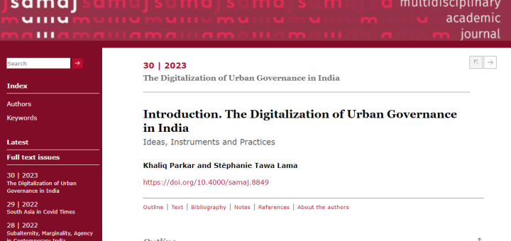 Parkar, Khaliq, and Stéphanie Tawa Lama. 2023. “Introduction. The Digitalization of Urban Governance in India: Ideas, Instruments and Practices.” South Asia Multidisciplinary Academic Journal (30).