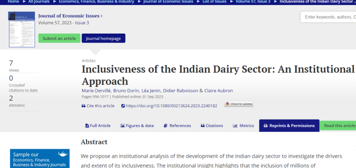 Dervillé, Marie, Bruno Dorin, Léa Jenin, Didier Raboisson, and Claire Aubron. 2023. “Inclusiveness of the Indian Dairy Sector: An Institutional Approach.” Journal of Economic Issues 57(3):994–1017