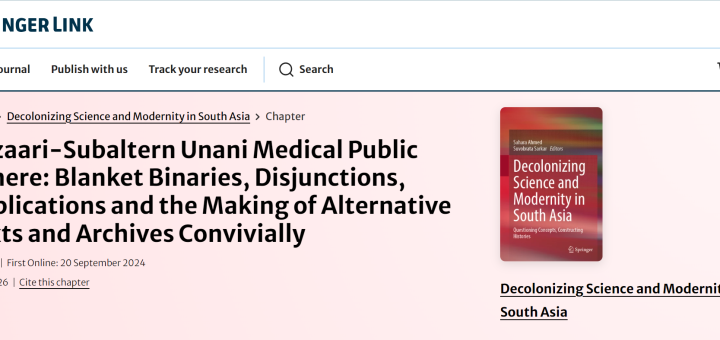 Quaiser, Neshat, 2024. “Bazaari-Subaltern Unani Medical Public Sphere: Blanket Binaries, Disjunctions, Implications and the Making of Alternative Texts and Archives Convivially.” Decolonizing Science and Modernity in South Asia.
