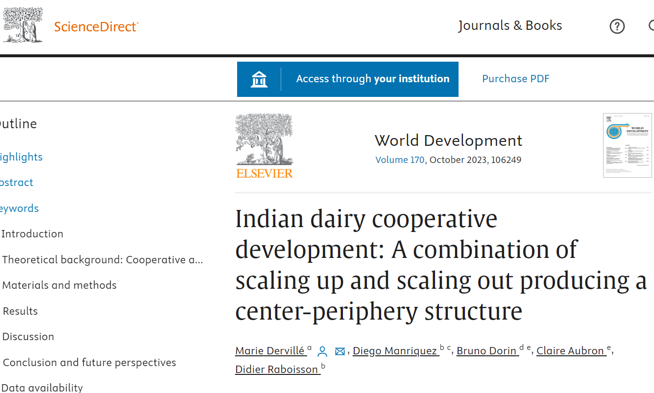 Dervillé, Marie, Diego Manriquez, Bruno Dorin, Claire Aubron, and Didier Raboisson. 2023. “Indian Dairy Cooperative Development: A Combination of Scaling up and Scaling out Producing a Center-Periphery Structure.” World Development, 170:106249.