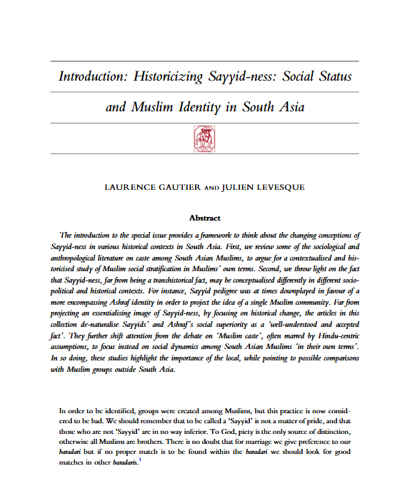 Gautier, L., & Levesque, J. (2020). Introduction: Historicizing Sayyid-ness: Social Status and Muslim Identity in South Asia. Journal of the Royal Asiatic Society, 1-11.
