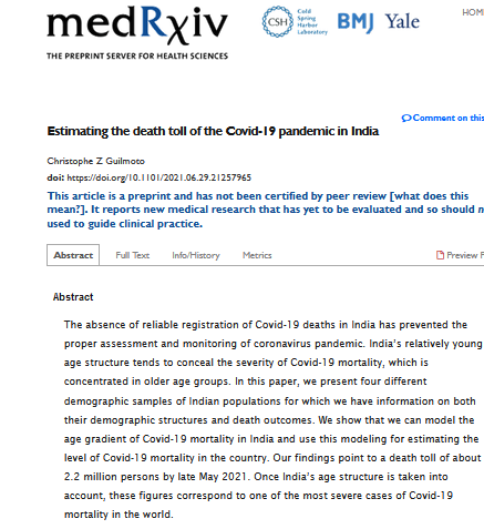 Guilmoto C., (2021), “Estimating the death toll of the Covid-19 pandemic in India” Medrxiv , (2 July 2021)