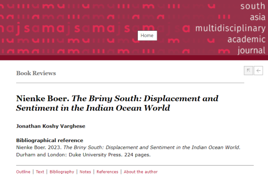 Varghese, Jonathan Koshy, “Nienke Boer. The Briny South: Displacement and Sentiment in the Indian Ocean World”, South Asia Multidisciplinary Academic Journal [Online], Book Reviews,