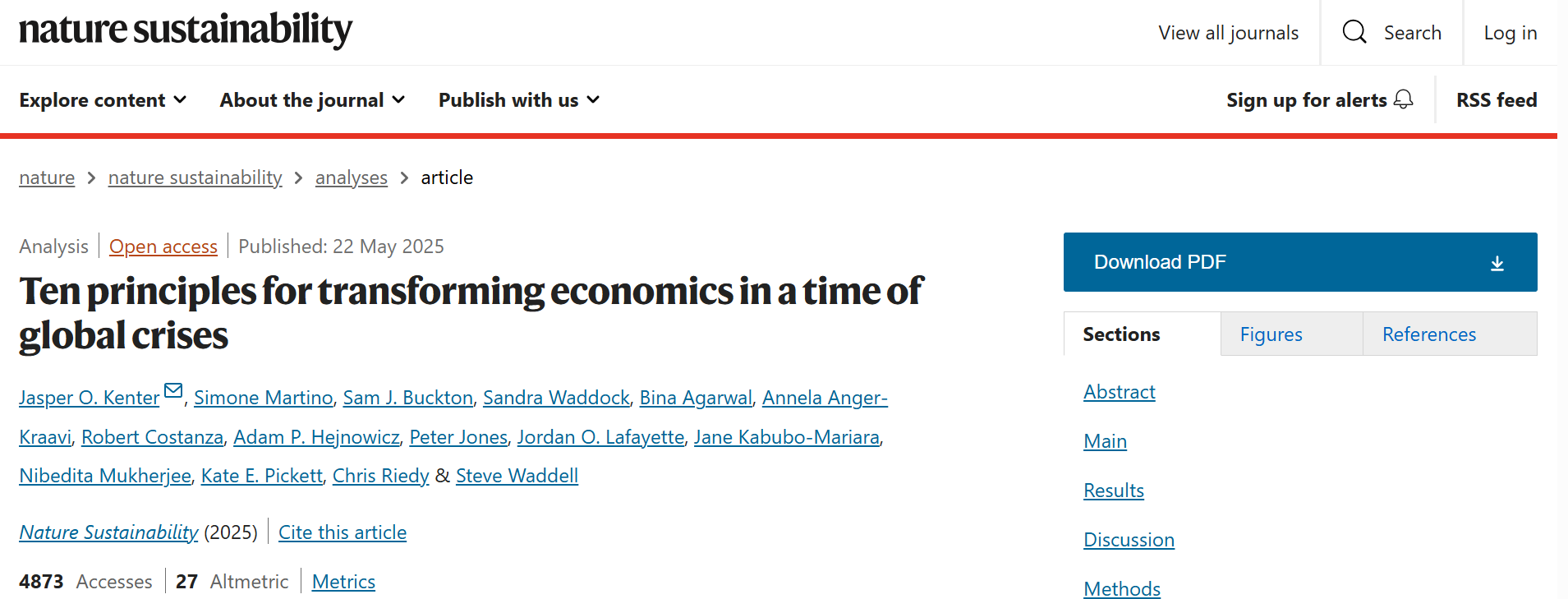 CSH is pleased to share Bina Agarwal’s (Associate Researcher, CSH) new research article “Ten principles for transforming economics in a time of global crises”, jointly written with Jasper O. Kenter, Simone Martino, Sam J. Buckton, Sandra Waddock, Annela Anger-Kraavi, Robert Costanza, Adam P. Hejnowicz, Peter Jones, Jordan O. Lafayette, Jane Kabubo-Mariara, Nibedita Mukherjee, Kate E. Pickett, Chris Riedy & Steve Waddell has been published in the journal Nature Sustainability on 22 May 2025.