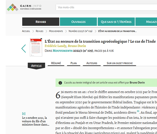 Dr. Bruno Dorin, a researcher at CIRAD has co-written an article entitled ” The State to the rescue of the agroecological transition? The case of India “. The article has been published in the Movements journal on 09 March 2022.