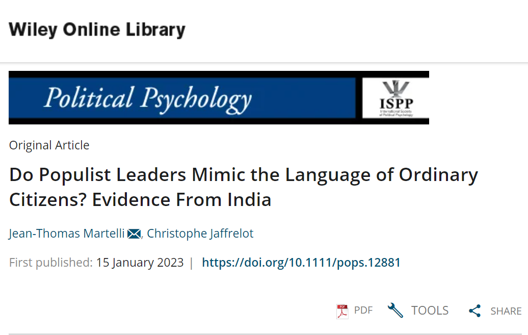 Martelli Jean-Thomas, Christophe Jaffrelot, 2023 “Do Populist Leaders Mimic the Language of Ordinary Citizens? Evidence From India.”, Political Psychology, 1-31.