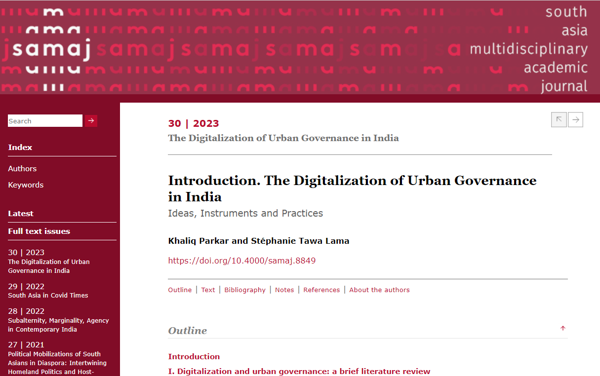 Stéphanie Tawa Lama, CSH Head Researcher of “Documenting Democracy: History, Politics, Citizenship” and CNRS Research Director (Political Science) at the Centre d’Etudes Sud-Asiatiques et Himalayennes (Cesah – EHESS/CNRS) and Khaliq Parkar, CESSMA, Université Paris Cité “Introduction. The Digitalization of Urban Governance in India: Ideas, Instruments and Practices.” published in the South Asia Multidisciplinary Academic Journal, no 30 “The Digitalization of Urban Governance in India”, on 7 July 2023.