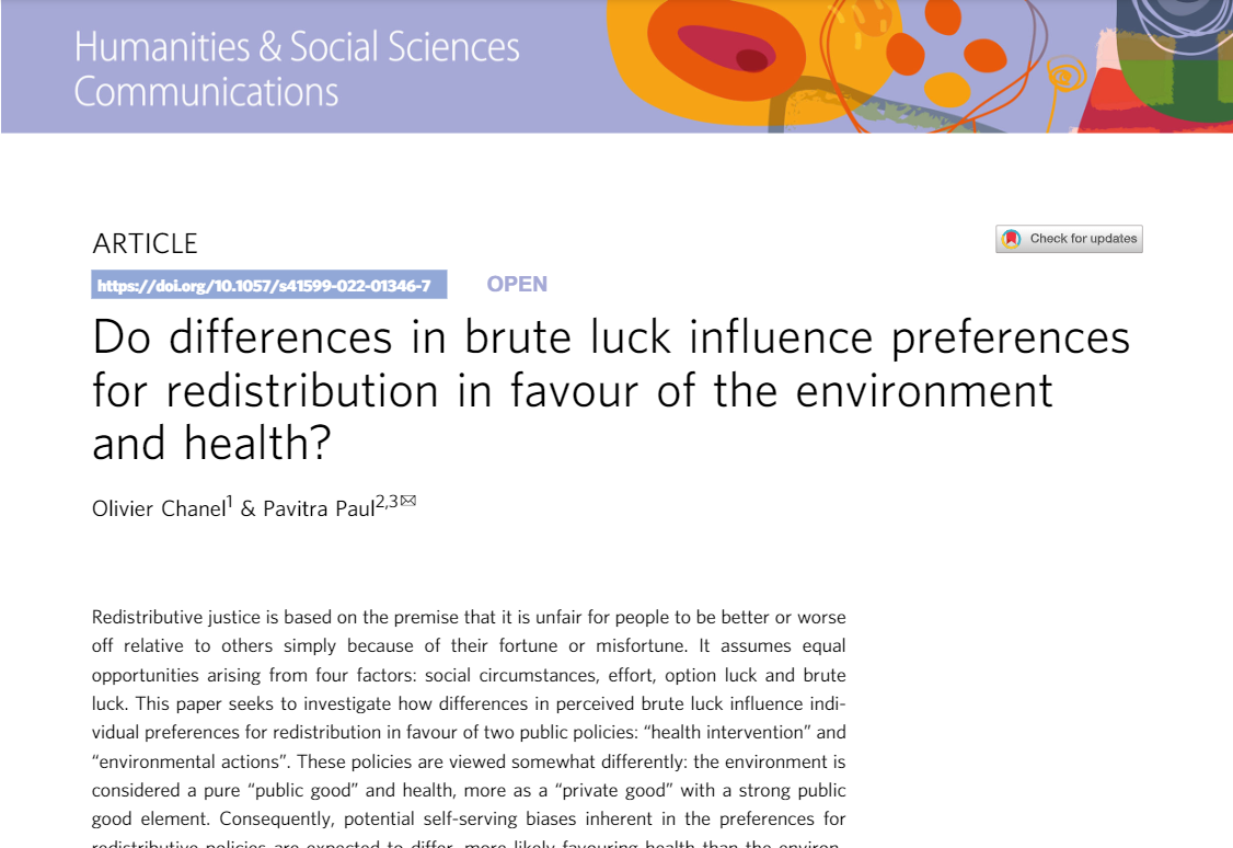 Paul Pavitra, Olivier Chanel. 2022. “Do differences in brute luck influence preferences for redistribution in favour of the environment and health?”, Humanities & Social Sciences Communications 9(338)