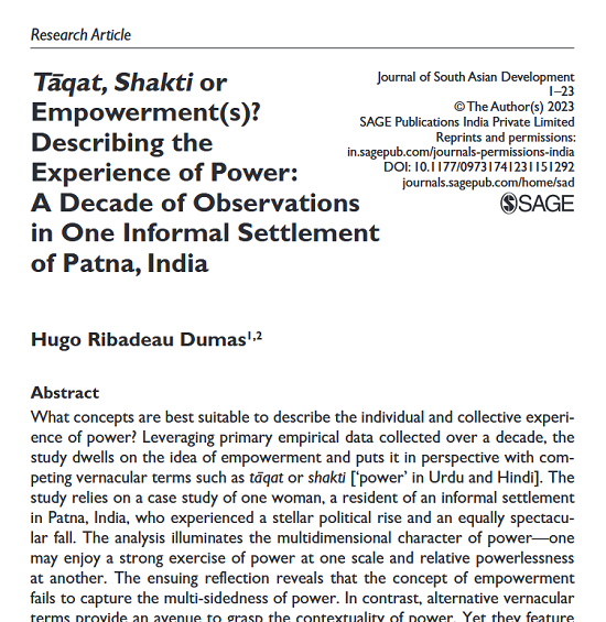 Hugo Ribadeau Dumas, Ph.D. scholar in Urban Geography at EHESS-Paris, authored an article entitled “Tāqat, Shakti or Empowerment(s)? Describing the Experience of Power: A Decade of Observations in One Informal Settlement of Patna, India” on 20 April 2023 in the Journal for South Asian Development.