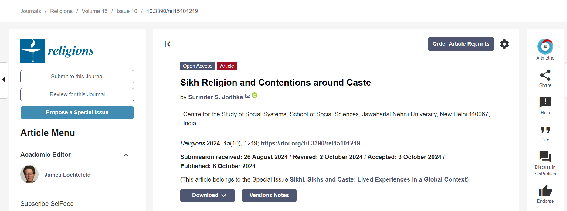 S. Jodhka, Surinder. 2024. “Sikh Religion and Contentions around Caste.” Religions.