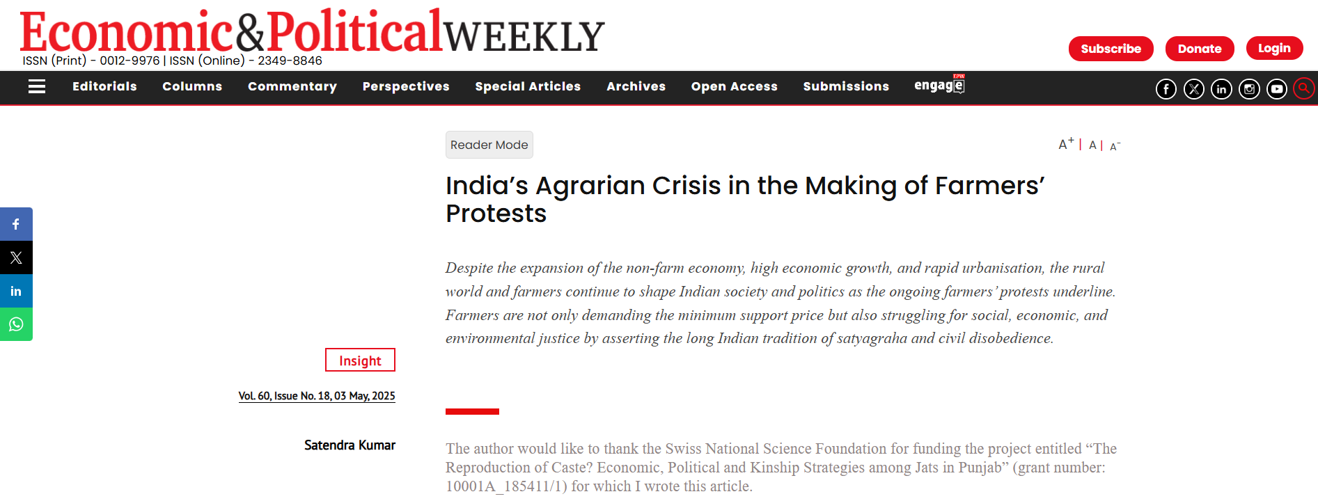 Kumar, Satendra. 2025. “India’s Agrarian Crisis in the Making of Farmers’ Protests.” Economic and Political Weekly.
