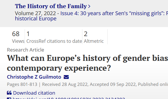 Guilmoto Z. Christophe, 2022. What can Europe’s history of gender bias tell us about Asia’s contemporary experience?, The History of the Family, 27:4, 801-813