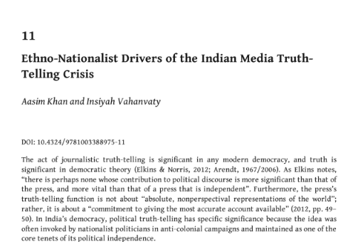 Khan, Aasim, and Insiyah Vahanvaty. 2023. “Ethno-Nationalist Drivers of the Indian Media Truth-Telling Crisis.” Pp. 196–218 in Re-thinking Mediations of Post-truth Politics and Trust. New York: Routledge.
